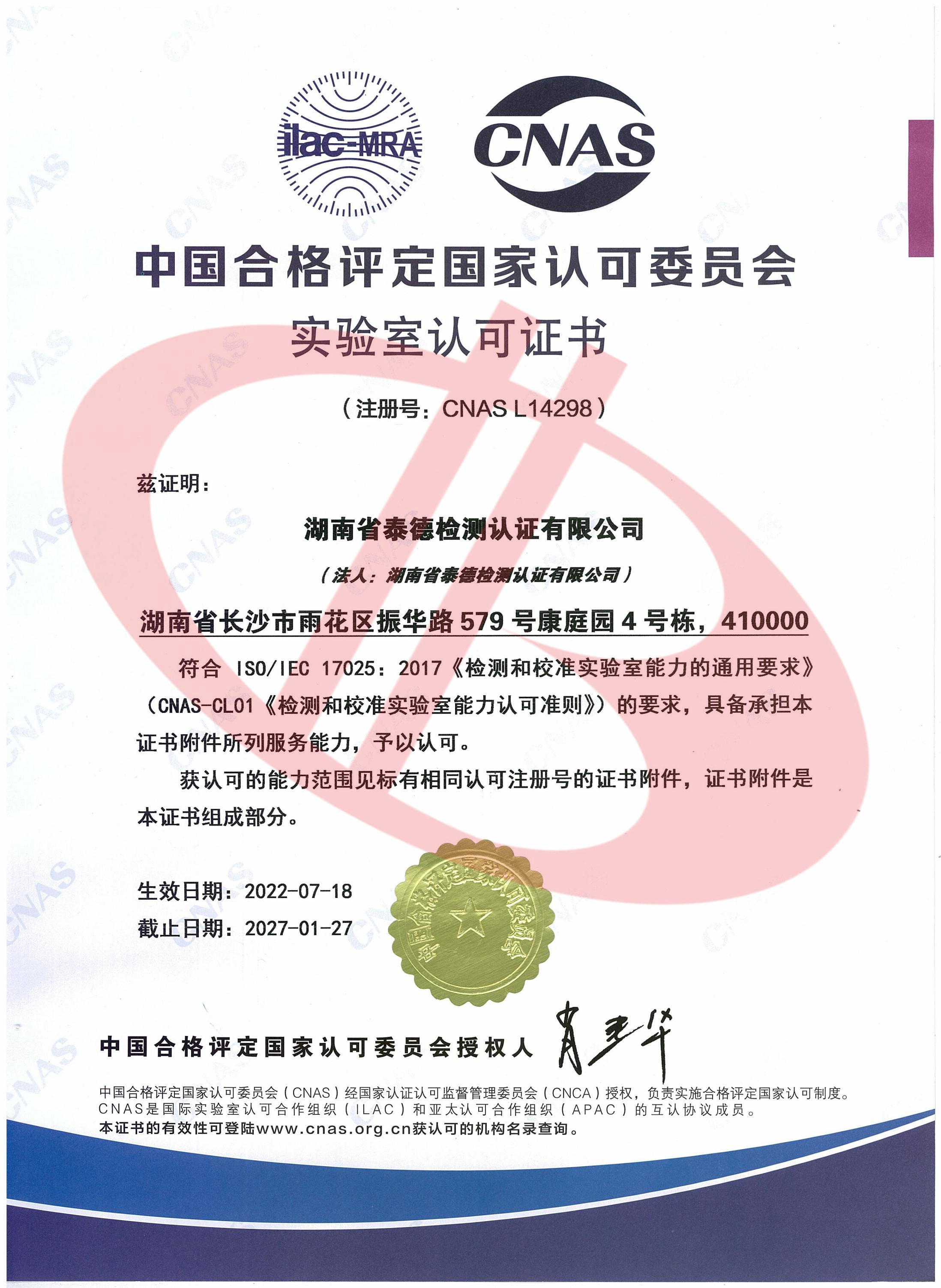 CNAS實驗室認可證書